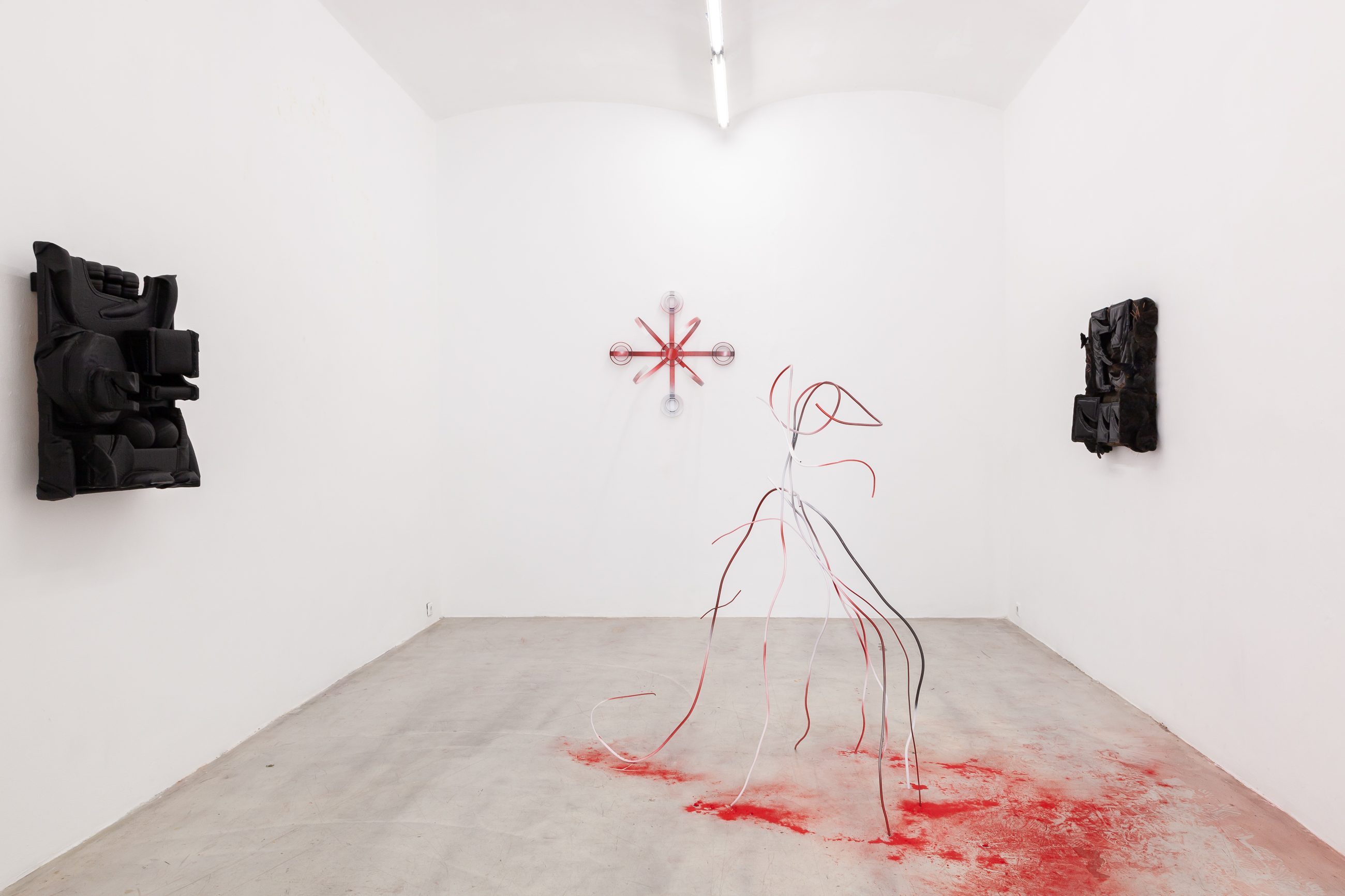 At first glance, the work of Cezary Poniatowski and Zuza Golińska at WAF evokes a dystopian landscape of retro-futurist doom. Beyond that initial impression, their pieces establish a compelling visual dialogue. The constructions, composed of leather, metal, carpet, and paint, are unlikely architectures, “worlds within worlds”. While the materials recall post-communist industrial decay, they seem to me to suggest speculative reconfigurations. It’s not merely affirmation of destruction that they offer, but improvised potentialities stitched from ruins.