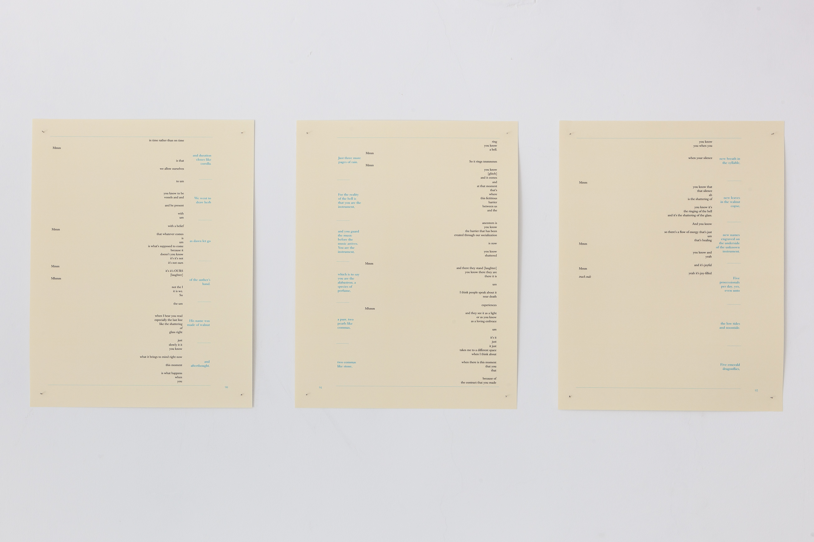 Earlier in the day, I visited one space that I had been looking forward to visiting for the first time, Prosopopoeia. The name refers to a rhetorical device in which a speaker or writer communicates by speaking as another person or object. This project space was initiated by Inga Charlotte Thiele, who came across the American-based artist JJJJJerome Ellis while working at PW Magazine and later invited him for this exhibition. The multiple Jâs in Ellisâ first name refer to the stutter he lives with and which his works often are informed by, incorporating it into his written and visual poetry as well as his performances. Working not despite but rather because of his stuttered speech, Ellis contests the âsocial regime of fluencyâ, finding another rhythm through spoken word within which time is created by the moments in between. I thought of Fred Moten saying: âAnyone who canât help but deviate can pretty much tell me anything.â A sequence of photos of the artist in the woods references the idea of a âclearingâ in the forest where one happens upon a meadow, analogous to clearings as âever present clarityâ as the exhibition text notes, or moments of silence during speech when one is trying to figure out the next word. On a perpendicular wall to the photos, poems formed in scores rather than stanzas are hung without frames. The soundtrack to the exhibition of Ellisâ meandering images is a spoken word performance emanating from speakers near a corner with a short shelf holding an intuitive selection of books. It was refreshing not to gauge any formal or obvious concept behind the book selection, instead I felt a sense of reflected pride in recognizing some friendsâ publications, as well as relief in finding authors and titles that I had searched for in Vienna but could not locate. With JJJJJeromeâs language punctuating the background, the opportunity to sit and peruse the shelf to the beat and unexpected breaks reflects an intimacy only an independent art space can evoke.