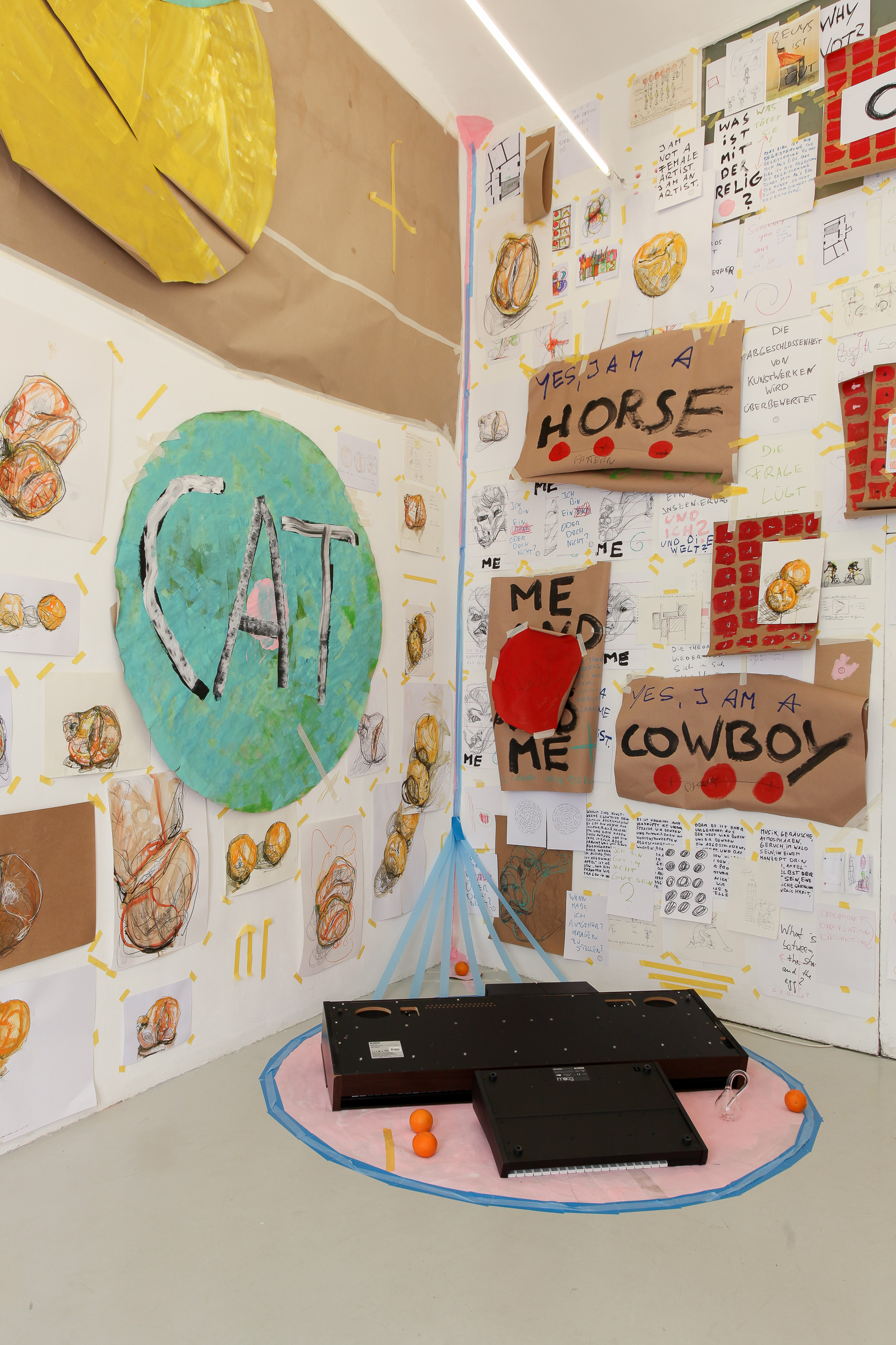 AE: Then we had this quick but intense run to find a bathroom and got quickly side-tracked at a birthday party/ drag event that was happening in a cafe nearby. There was a moment when a beautiful drag queen laughed with us when my daughter called a painting of Mary with Jesus the queen of fairies. That resulted in a very quick crash course in European religious iconography next to a bathroom, which may have hindered or helped our understanding of all of the spaces we were visiting. Ve.Sch was an especially lovely stop where we got a tour by Jennifer Gelardo through the exhibition âDrama of Consensusâ and the years of exhibition photography that predated that exhibition. We even left with small little mementos of one installation in the show itself.
