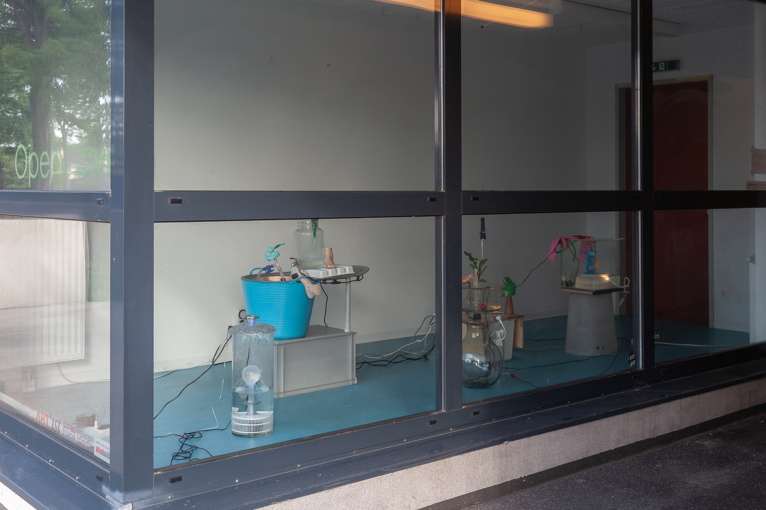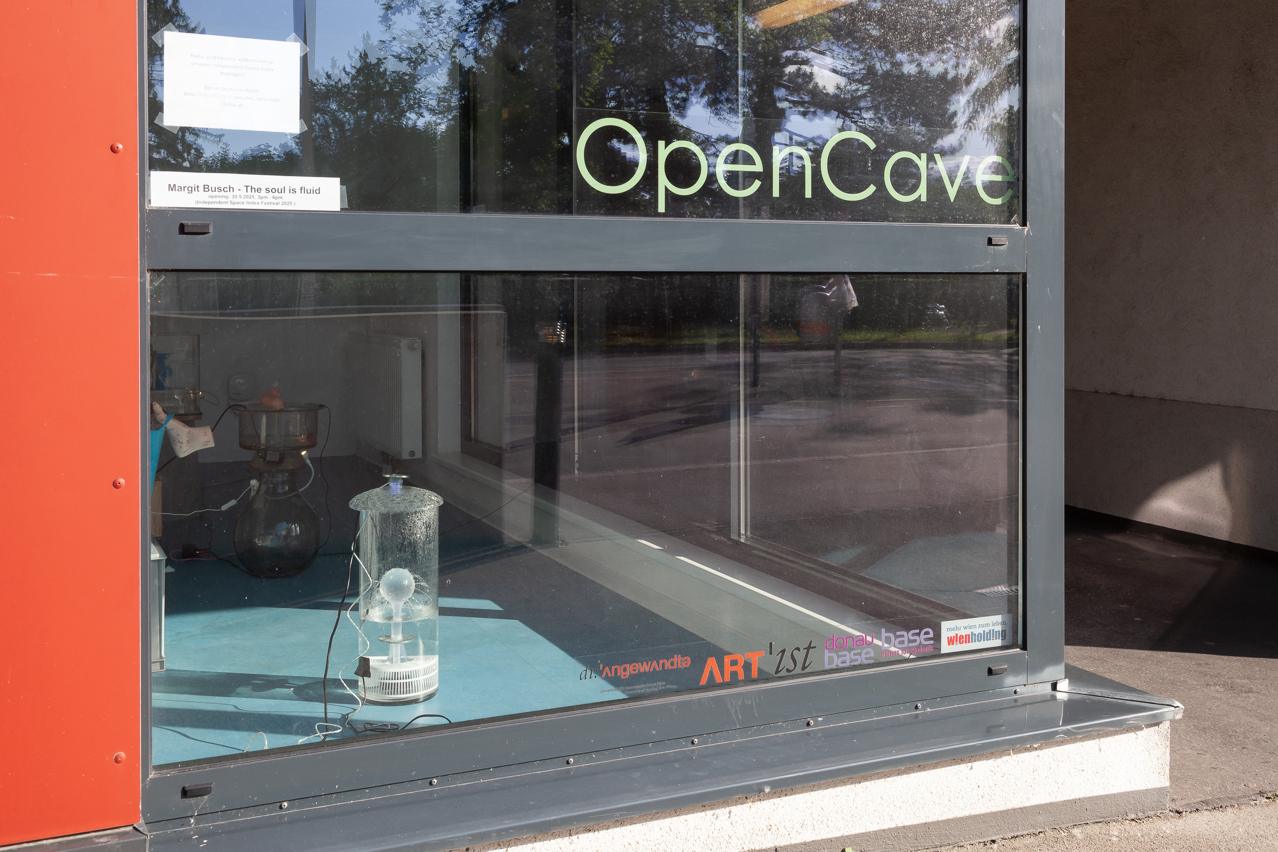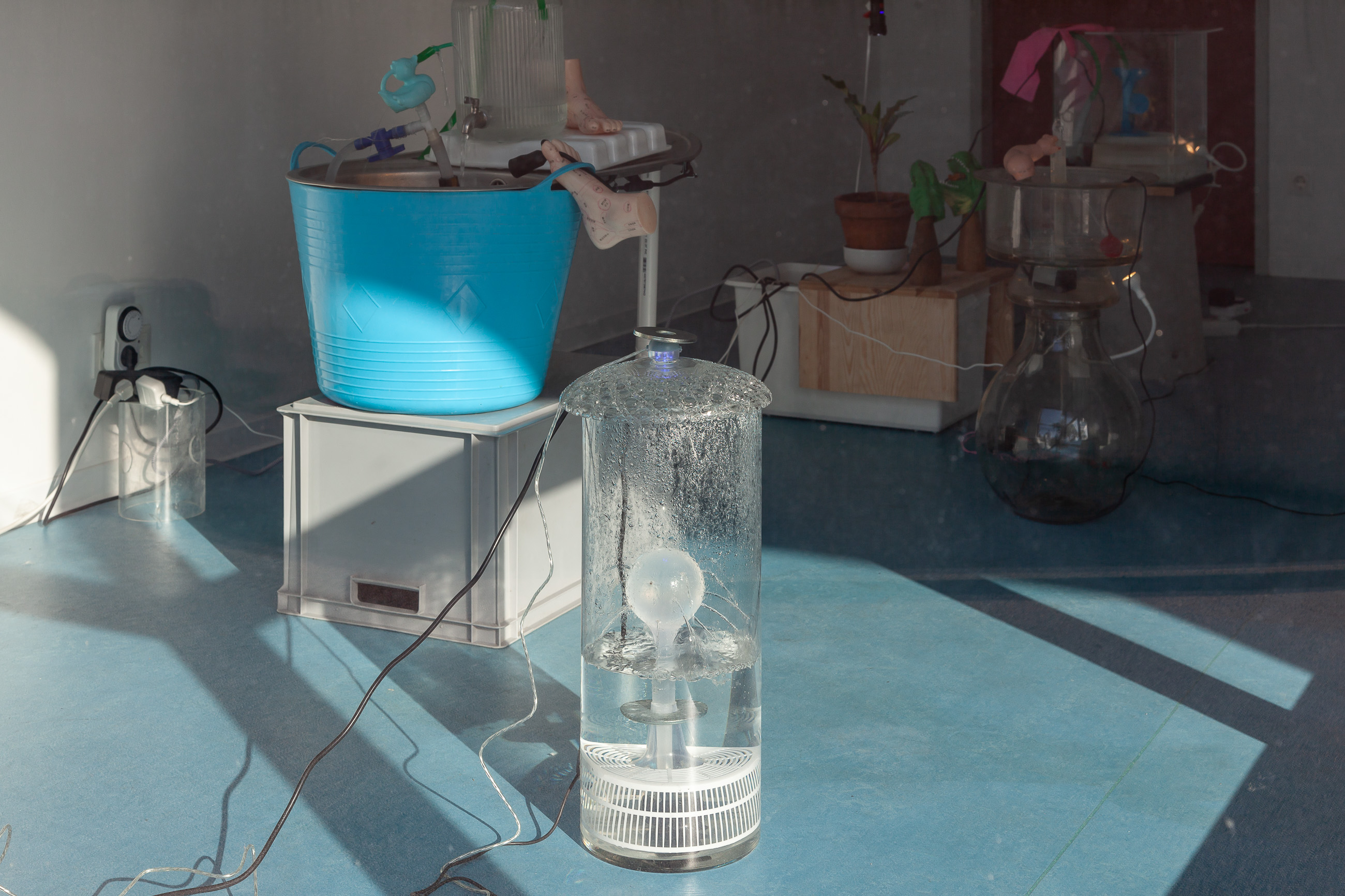 In her dissertation, “A Garden for a Fish,” the artist explores gardens, parks, paradise, and a human-shaped nature in which the natural must nevertheless remain an essential and tangible component. “The Soul Is Fluid” reflects on this and depicts fountains gently bubbling. Lamps cast shadows on the walls, and the sounds are recorded and transmitted onto or through the glass panes. A moment of meditation—a little balm for the soul.