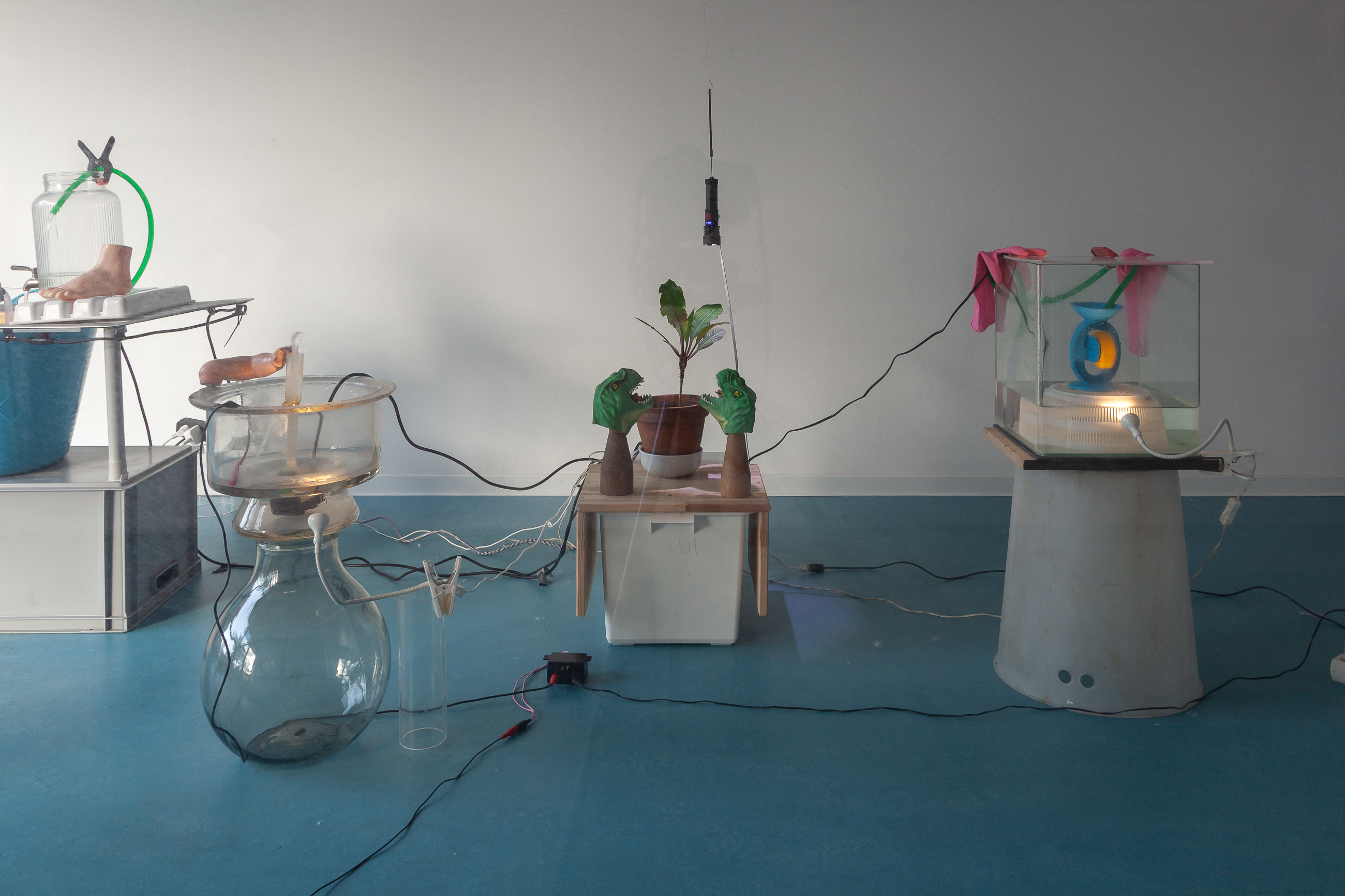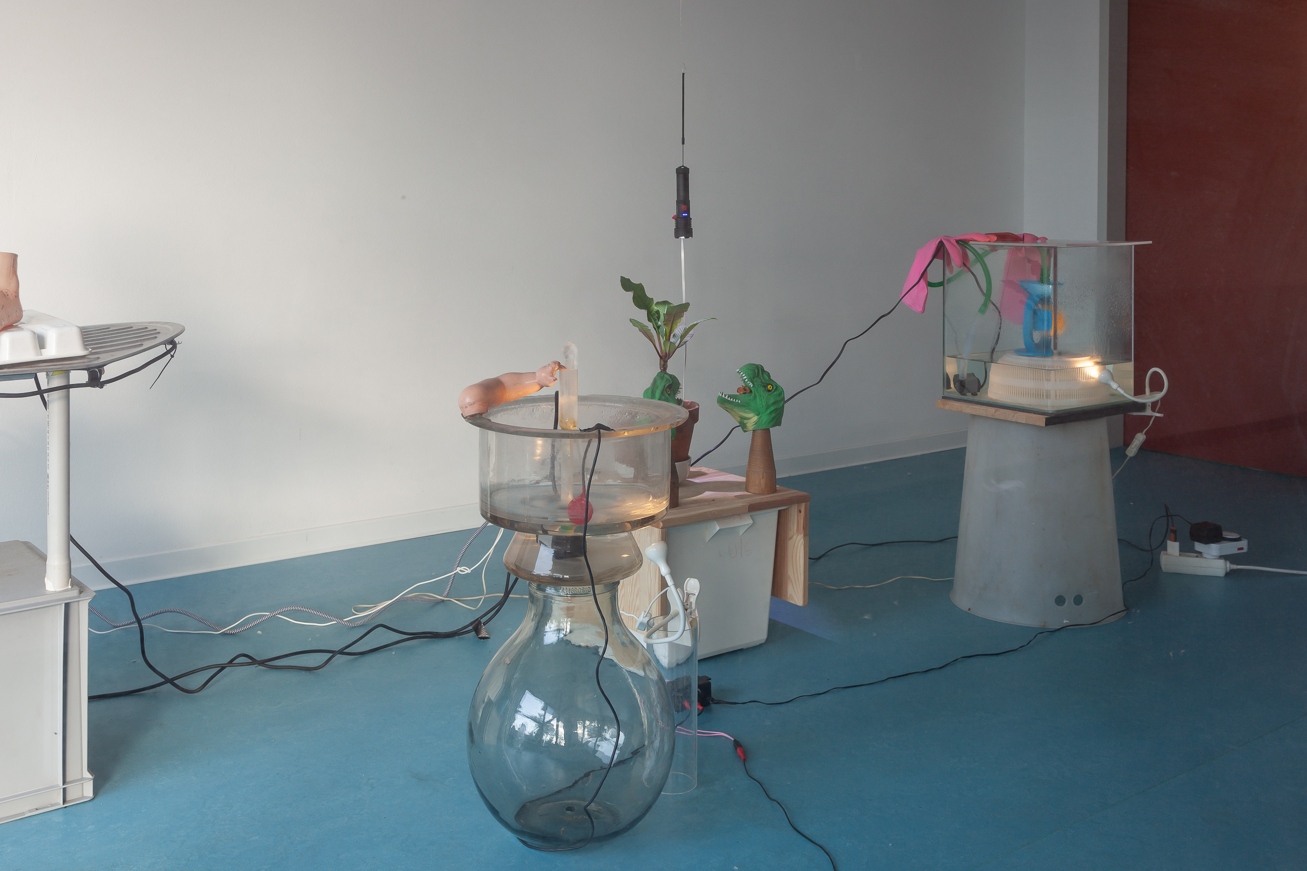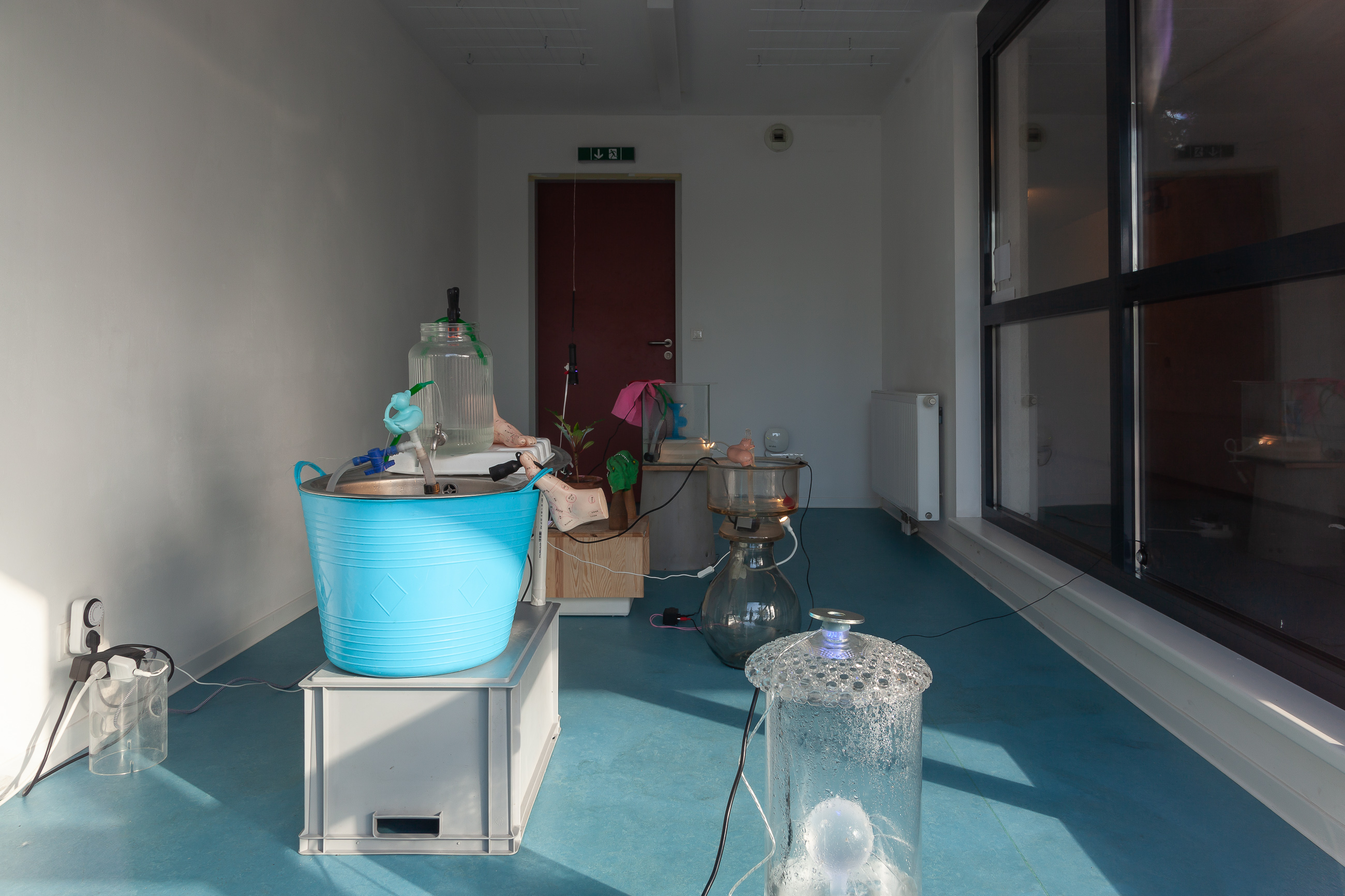 In her dissertation, “A Garden for a Fish,” the artist explores gardens, parks, paradise, and a human-shaped nature in which the natural must nevertheless remain an essential and tangible component. “The Soul Is Fluid” reflects on this and depicts fountains gently bubbling. Lamps cast shadows on the walls, and the sounds are recorded and transmitted onto or through the glass panes. A moment of meditation—a little balm for the soul.