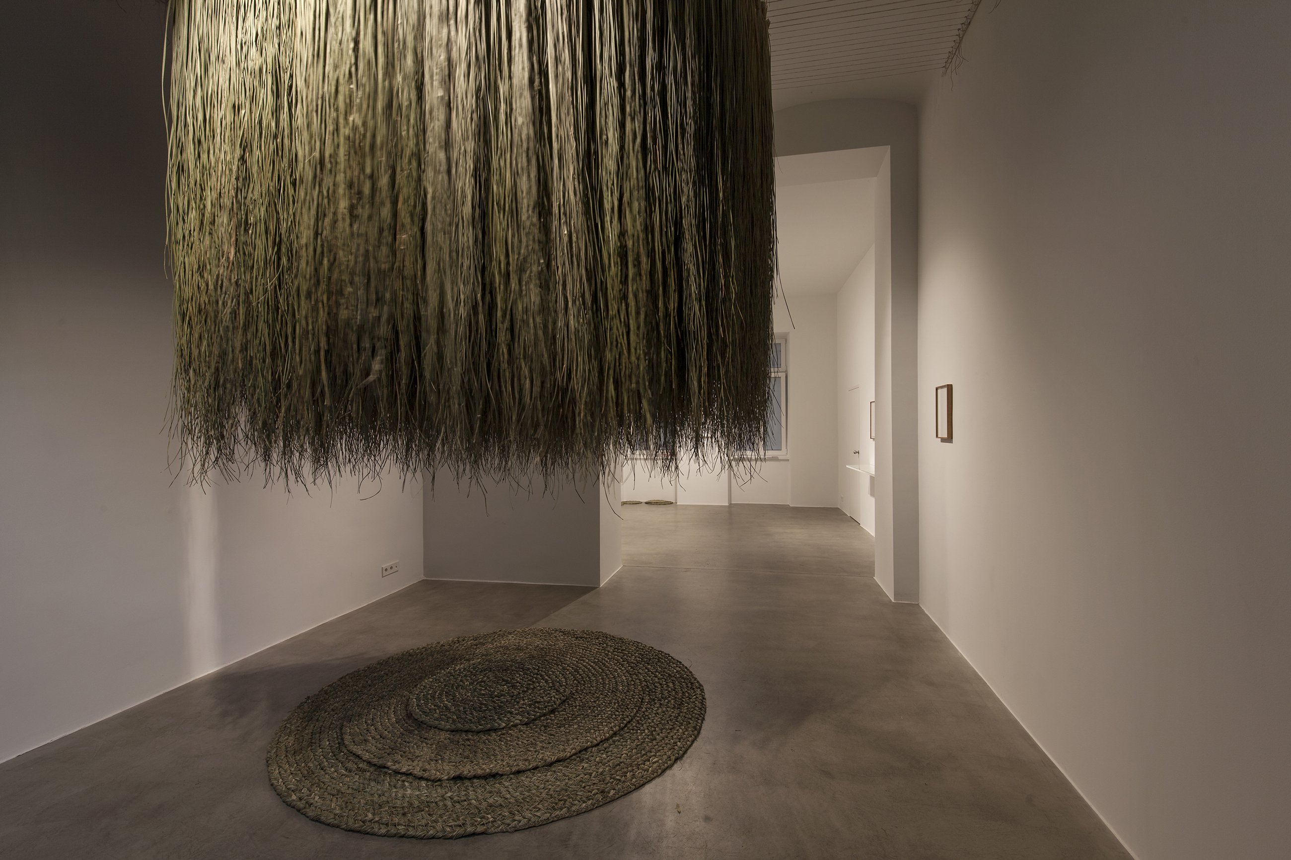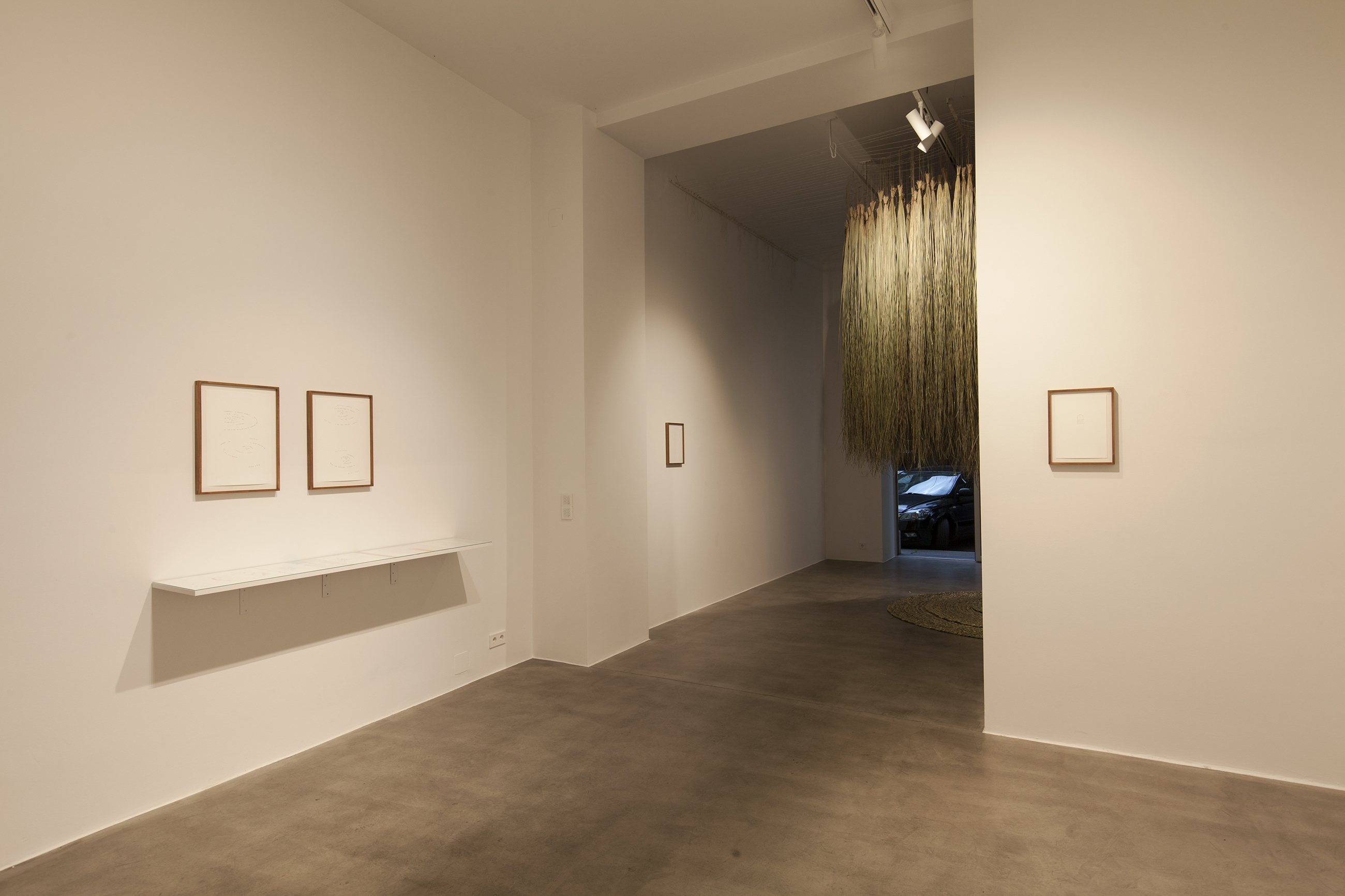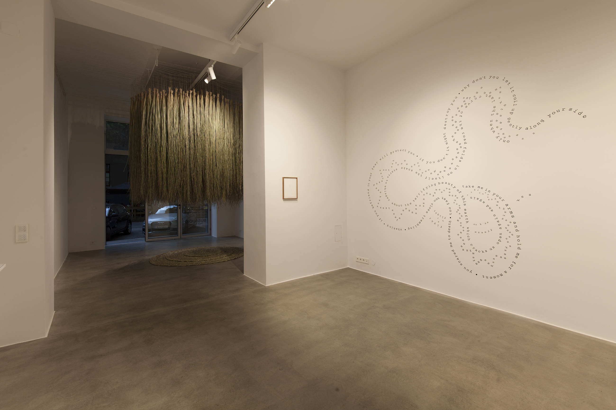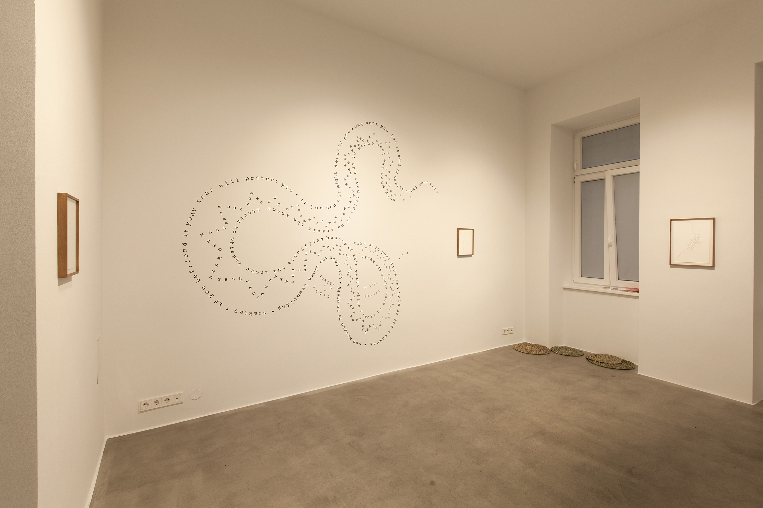The exhibition presents a dialogic confluence between visual art, poetry and the natural world. Alja Piry’s calligrams are symbiotic with the rudimentary design of Mateja Kavčič’s spatial installation. The exhibition is grounded in the interplay between the outside environment and the intimate inner world, conveying the subtler human perceptions and emotions. The overarching themes are equally present in the work of both artists as they individually recreate the chosen natural environment, while further narrating an all-encompassing connectedness through the contact of their artistic languages. Nature is present physically, but also as a metaphor for the human psyche: representing parts that are harder to reach, but invaluable to consider. Sara Nuša Golob Grabner (excerpt).