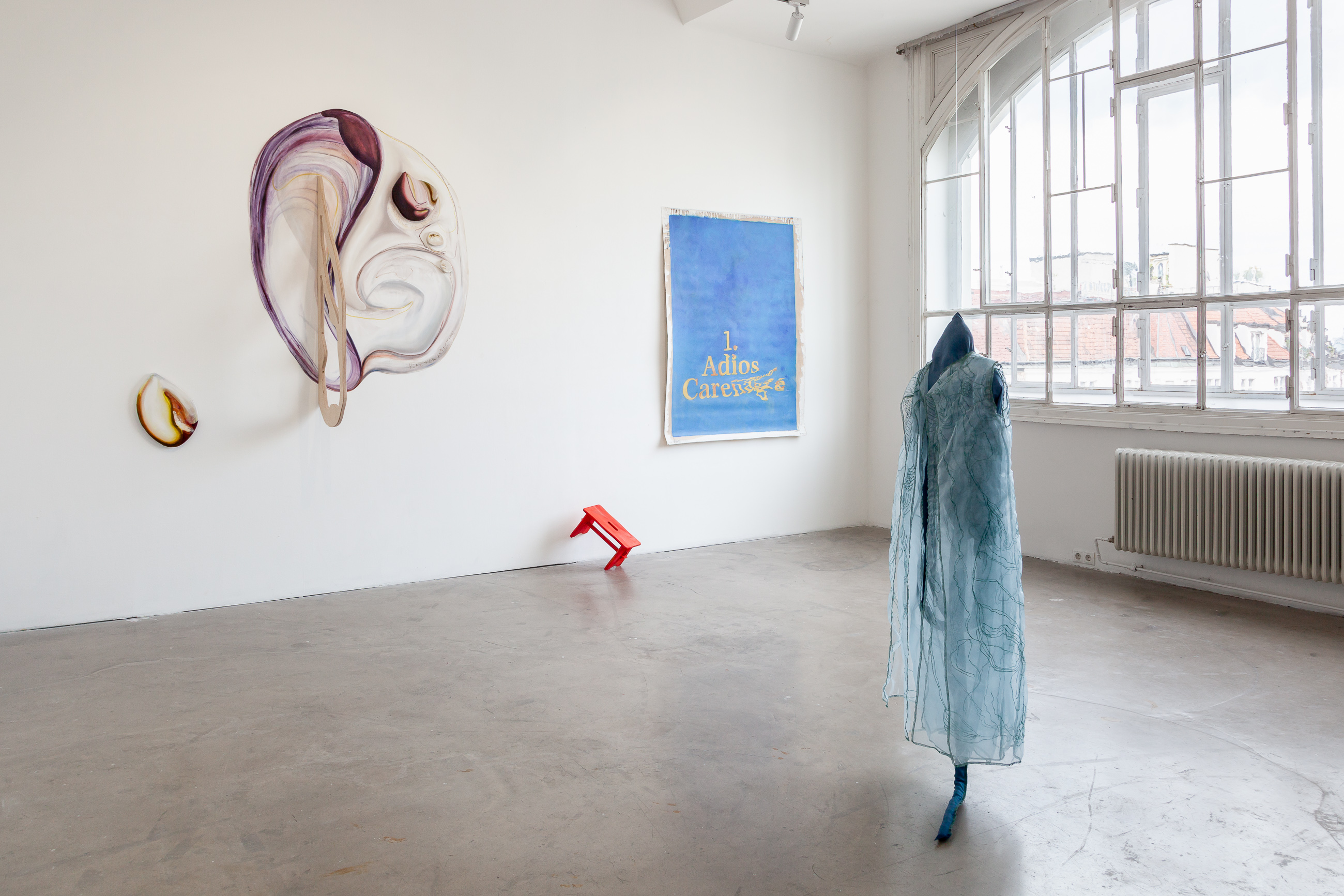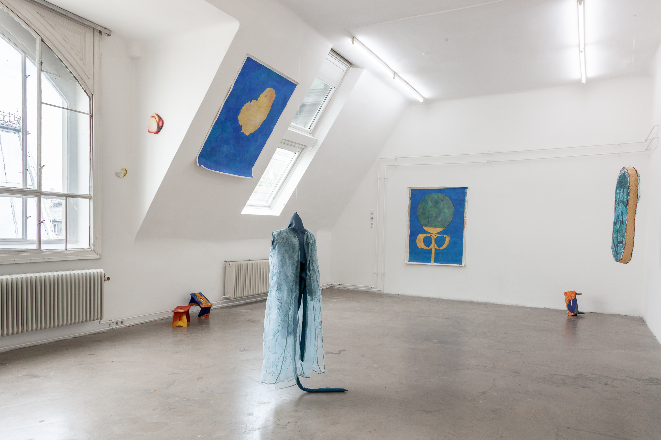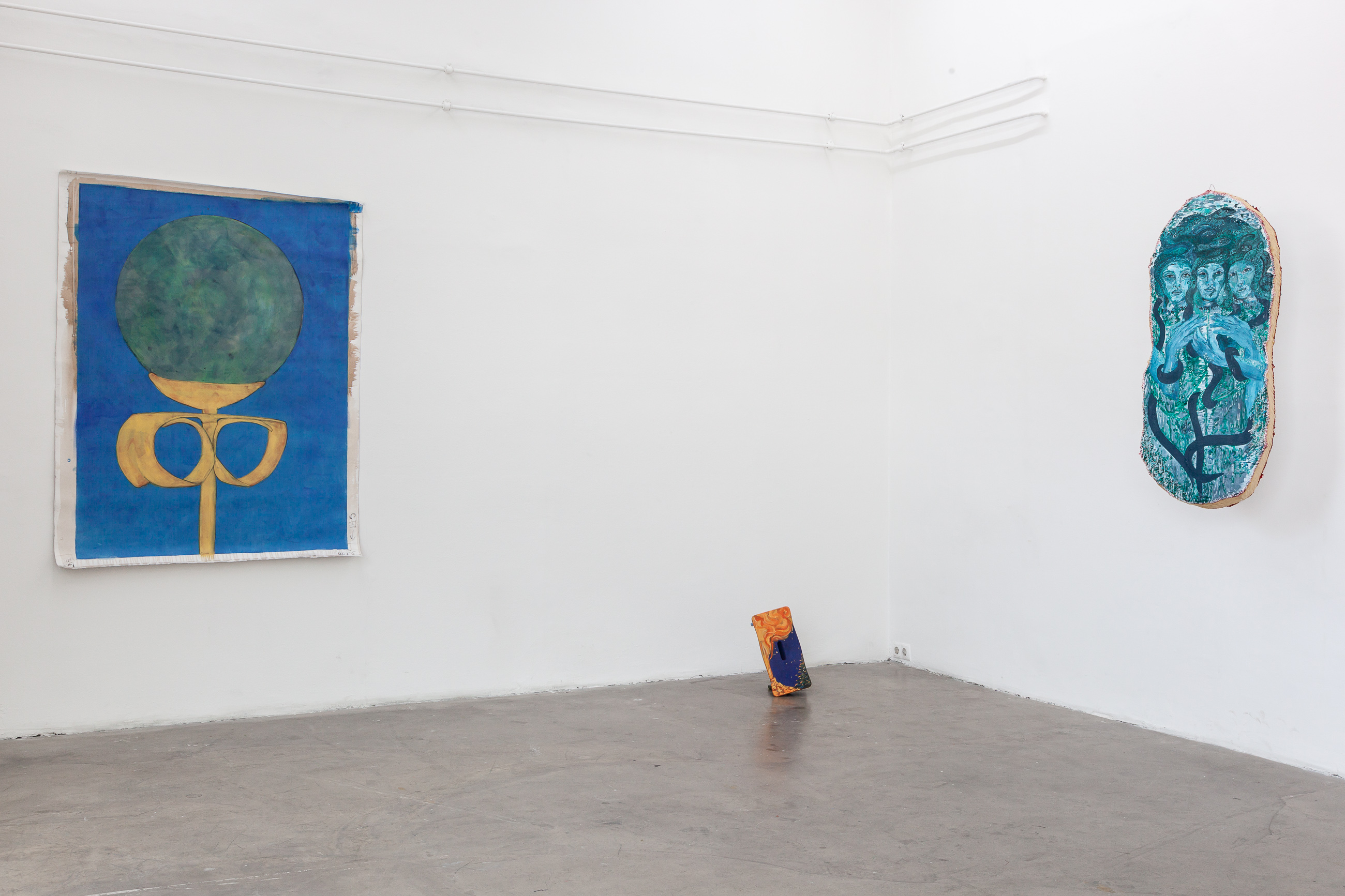 With Maria Paraffina as their collective alter ego, Felisha Carénage, Luiza Furtado and Anne Meerpohl revel in the absurdly demonic tropes of femininity that occur in their seaside hometowns. Their third exhibition as Maria finds each of the painters in a typical European city divided by a river - Hamburg, Vienna, Berlin. From here they navigate the continent outwards - back to Florianopolis, Eckernförde and San Fernando. Playing with the rules of painting, performance and textiles, they confuse their own Maria iconography, distorting the mirrors of her face, rowing waves into rivulets, gushing watery futures.