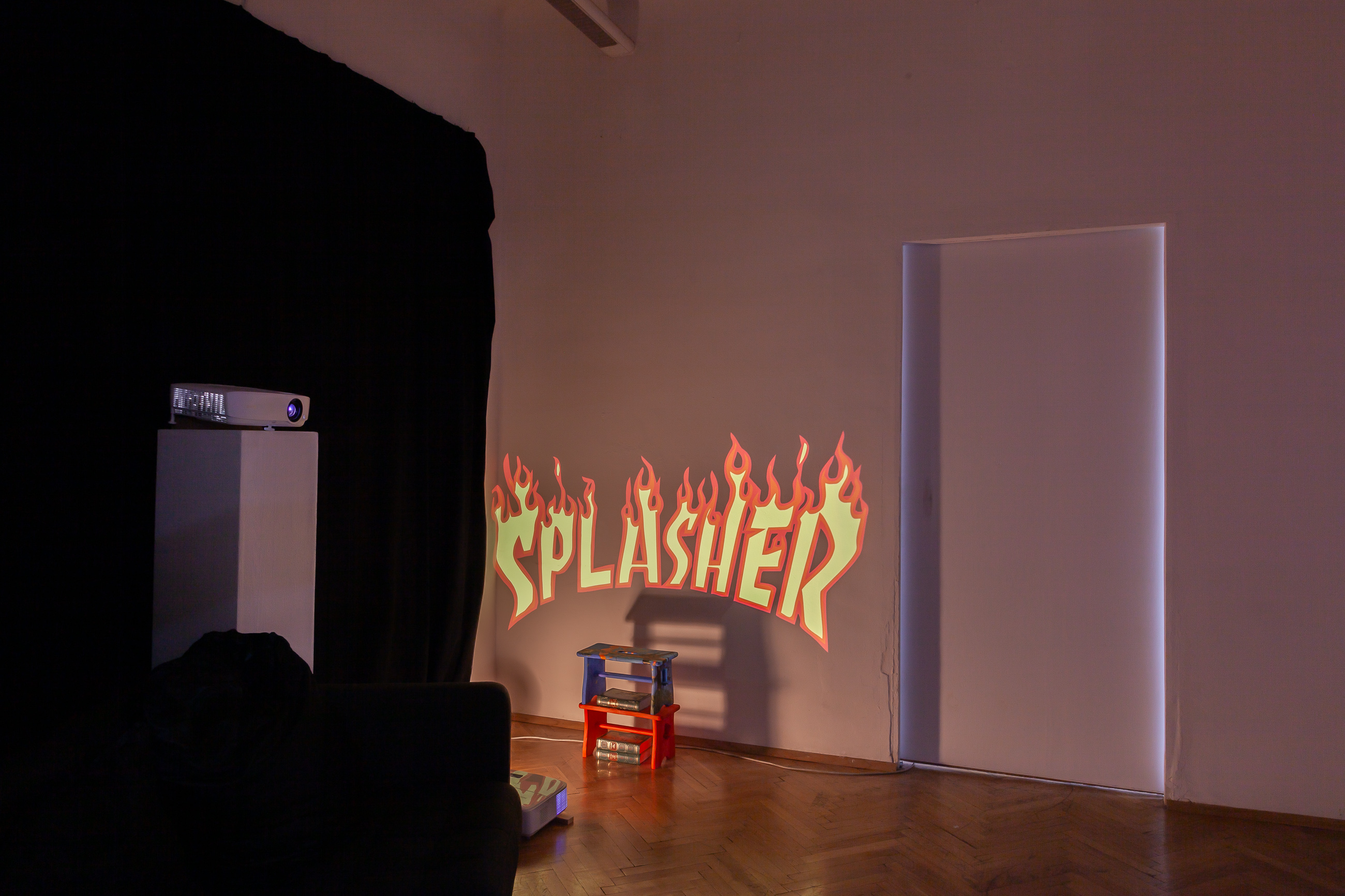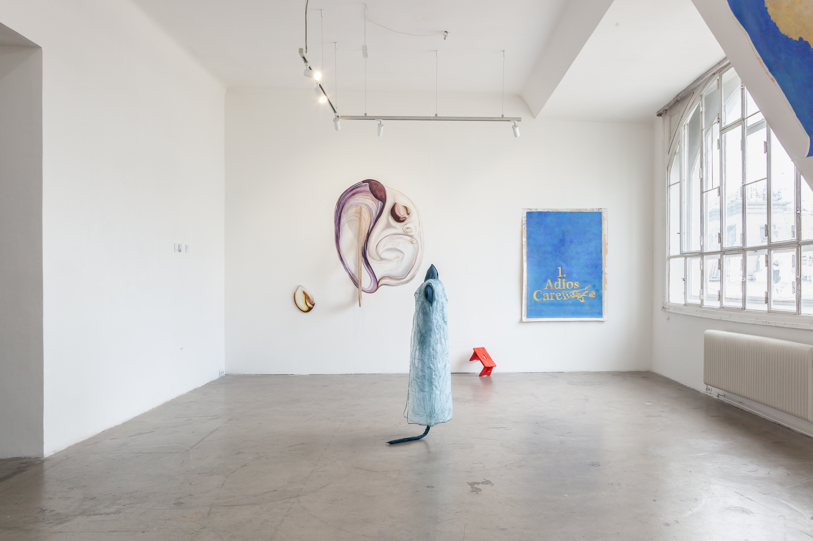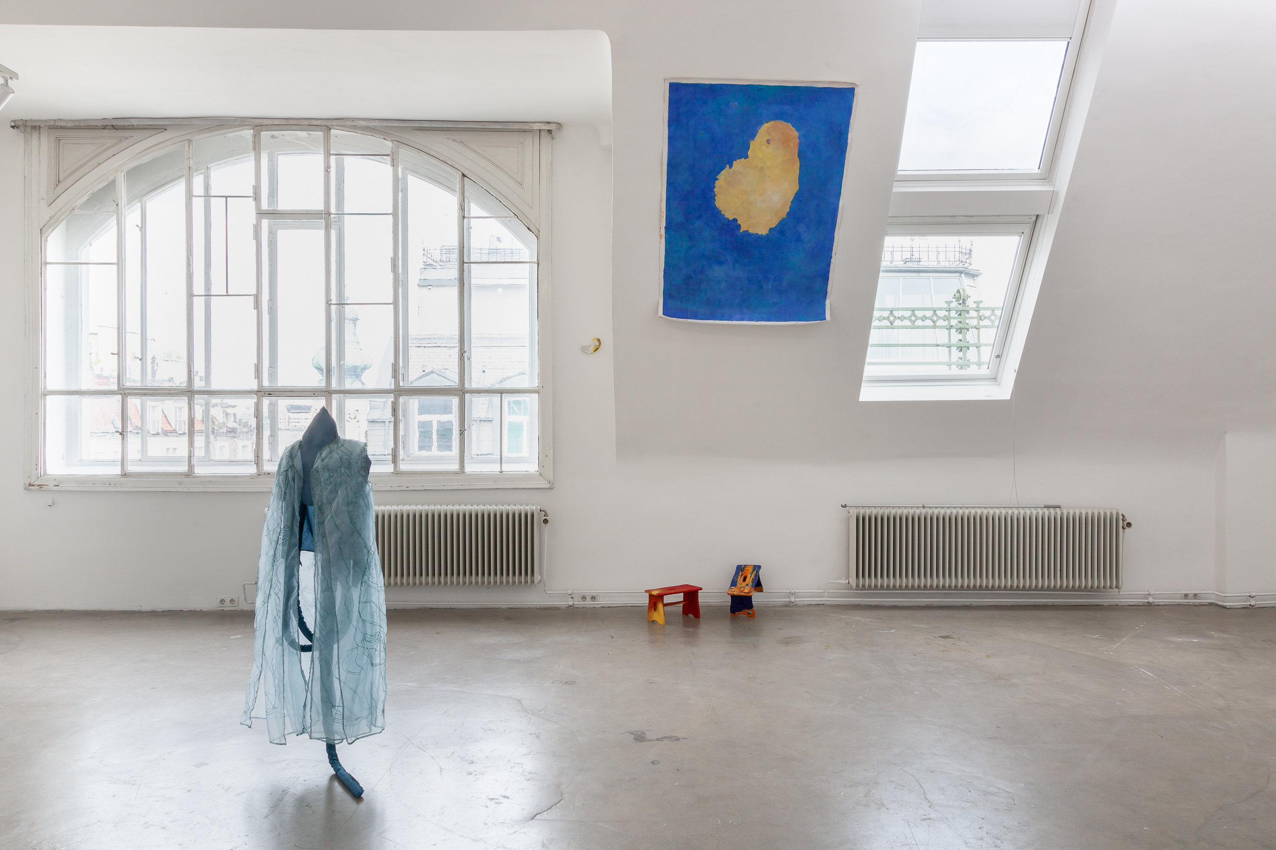 With Maria Paraffina as their collective alter ego, Felisha Carénage, Luiza Furtado and Anne Meerpohl revel in the absurdly demonic tropes of femininity that occur in their seaside hometowns. Their third exhibition as Maria finds each of the painters in a typical European city divided by a river - Hamburg, Vienna, Berlin. From here they navigate the continent outwards - back to Florianopolis, Eckernförde and San Fernando. Playing with the rules of painting, performance and textiles, they confuse their own Maria iconography, distorting the mirrors of her face, rowing waves into rivulets, gushing watery futures.